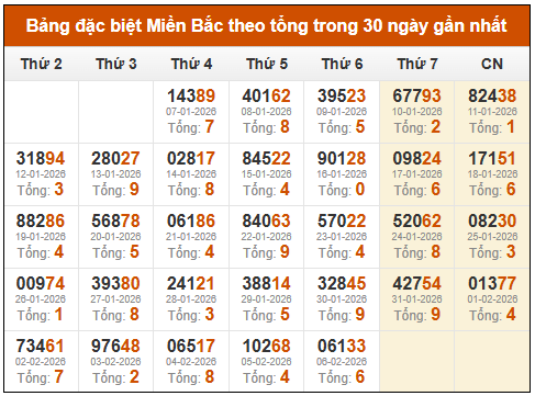 Thống kê GĐB miền Bắc theo tổng trong 30 ngày tính đến 08/02/2026