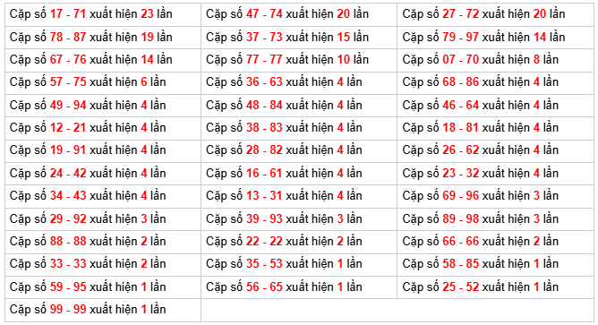 ⇒ ⇒ Từ bảng thống kê ta thấy tổng đặc biệt lâu không xuất hiện nhất là tổng 0, bao gồm 10 cặp số (00, 19, 28, 37, 46, 55, 64, 73, 82, 91), với tần suất 21 ngày chưa ra.