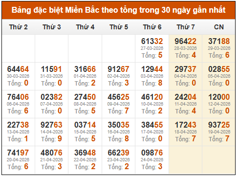 ⚡ Thống kê GĐB xổ số miền Bắc theo tổng: 26/04/2025