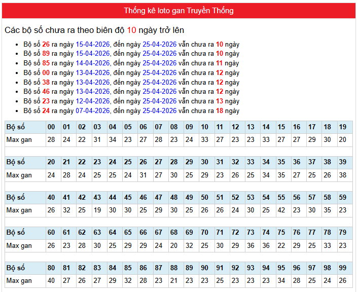 Bảng Thống kê phân tích loto gan Truyền Thống Miền Bắc