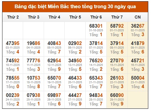 ⚡ Thống kê GĐB xổ số miền Bắc theo tổng: 01/12/2025