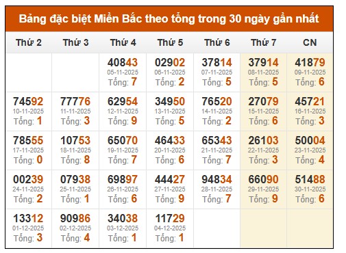 ⚡ Thống kê GĐB xổ số miền Bắc theo tổng:06/12/2025