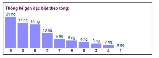⇒ Từ bảng thống kê ta thấy tổng đặc biệt lâu không xuất hiện nhất là tổng 5 , bao gồm 10 cặp số :( 05, 14, 23, 32, 41, 50, 69, 78, 87, 96), với tần suất 21 ngày chưa ra.