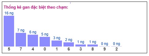 ⇒ Số liệu thống kê cho biết chạm ĐB lâu không xuất hiện nhất là chạm 5 , bao gồm 19 cặp số chứa số 5 . Đã trải qua 16 ngày chưa về.