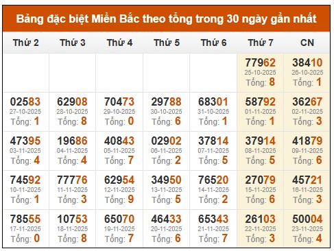 Thống kê GĐB miền Bắc theo tổng trong 30 ngày tính đến 25/11/2025