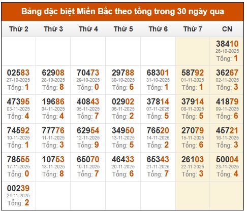 Thống kê GĐB miền Bắc theo tổng trong 30 ngày tính đến 26/11/2025