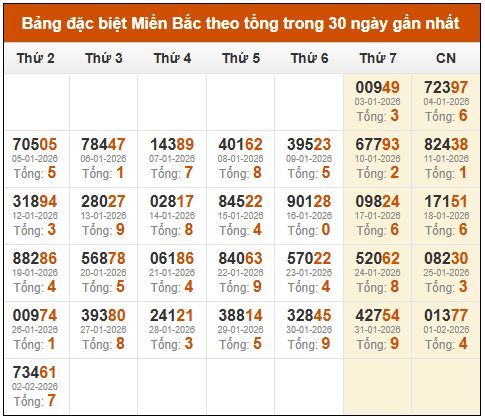 ⚡ Thống kê GĐB xổ số miền Bắc theo tổng: 04/02/2025