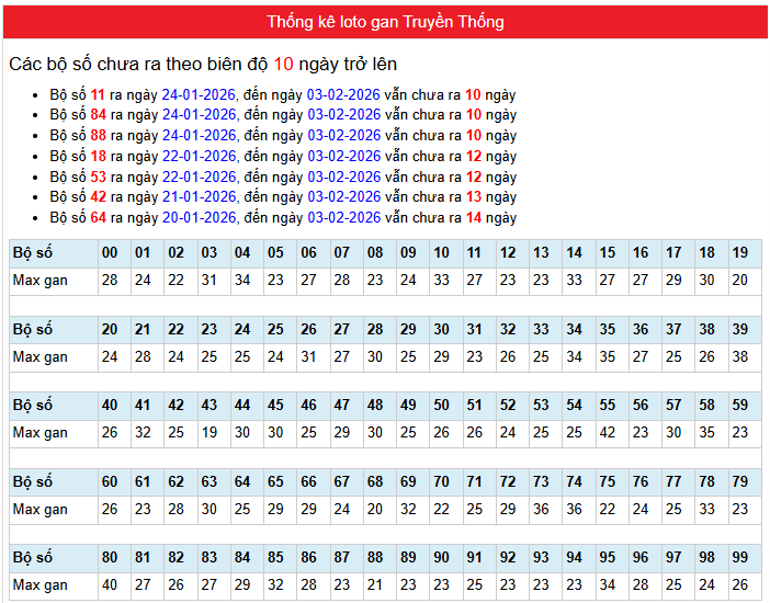 Bảng Thống kê phân tích loto gan Truyền Thống Miền Bắc