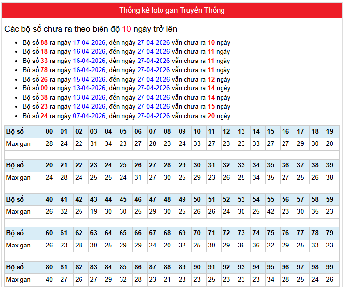 Bảng Thống kê phân tích loto gan Truyền Thống Miền Bắc