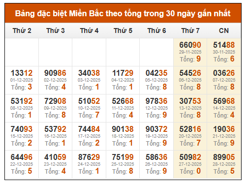 ⚡ Thống kê GĐB xổ số miền Bắc theo tổng: 30/12/2025