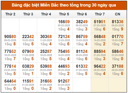 ⚡ Thống kê GĐB xổ số miền Bắc theo tổng: 04/04/2025