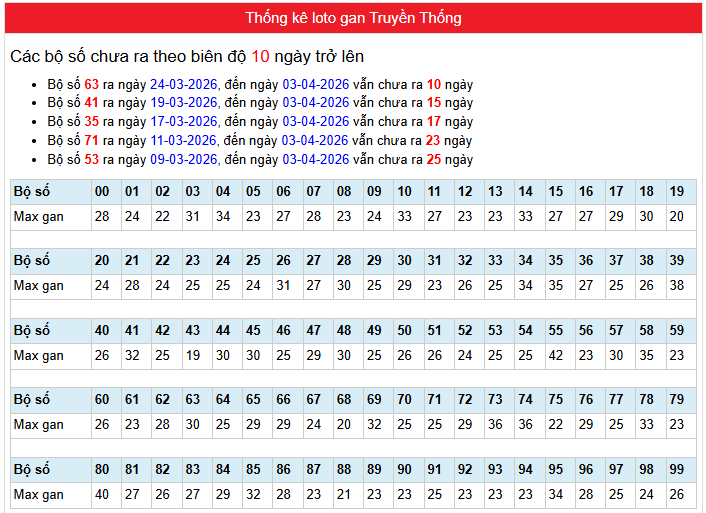 Bảng Thống kê phân tích loto gan Truyền Thống Miền Bắc