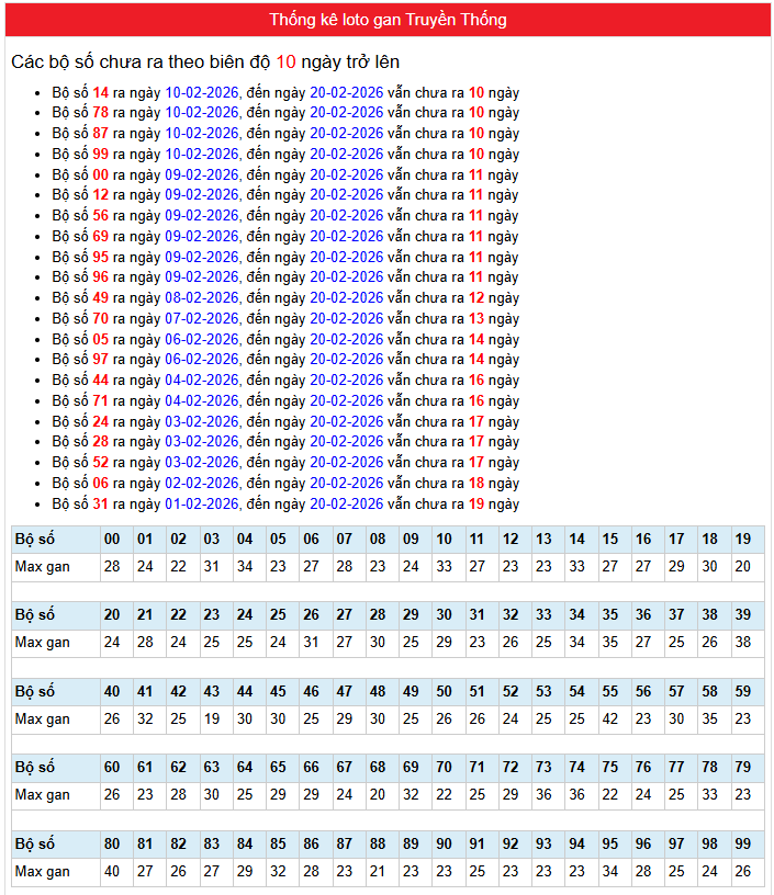 Bảng Thống kê phân tích loto gan Truyền Thống Miền Bắc