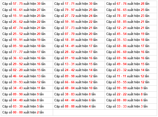 ⇒ ⇒ Từ bảng thống kê ta thấy tổng đặc biệt lâu không xuất hiện nhất là tổng 0, bao gồm 10 cặp số (00, 19, 28, 37, 46, 55, 64, 73, 82, 91), với tần suất 30 ngày chưa ra.