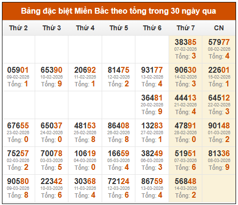 ⚡ Thống kê GĐB xổ số miền Bắc theo tổng: 16/03/2025