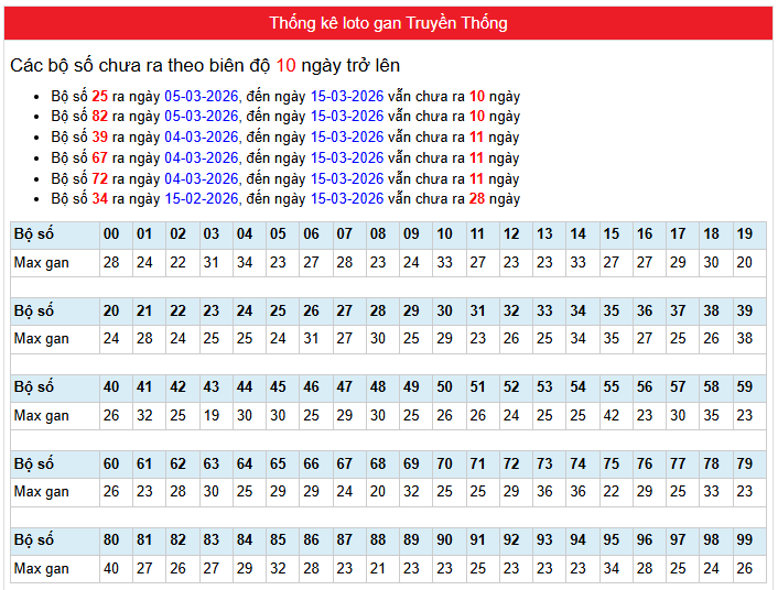 Bảng Thống kê phân tích loto gan Truyền Thống Miền Bắc