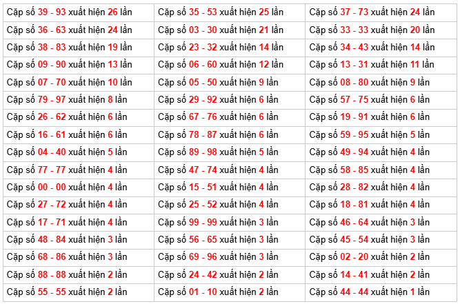 ⇒ Dựa vào bảng thống kê trên, ta thấy tổng 1 lâu chưa xuất hiện nhất (gồm 10 cặp số là: 01, 10, 29, 38, 47, 56, 65, 74, 83, 92), trải qua 18 ngày chưa ra.