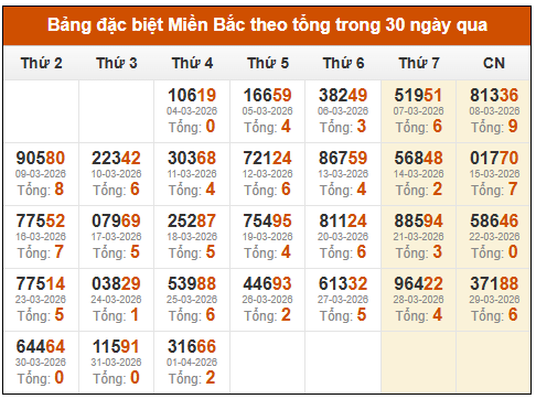 Thống kê GĐB miền Bắc theo tổng trong 30 ngày tính đến 03/04/2026