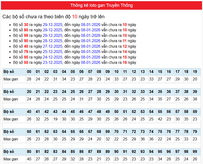 Bảng Thống kê phân tích loto gan Truyền Thống Miền Bắc