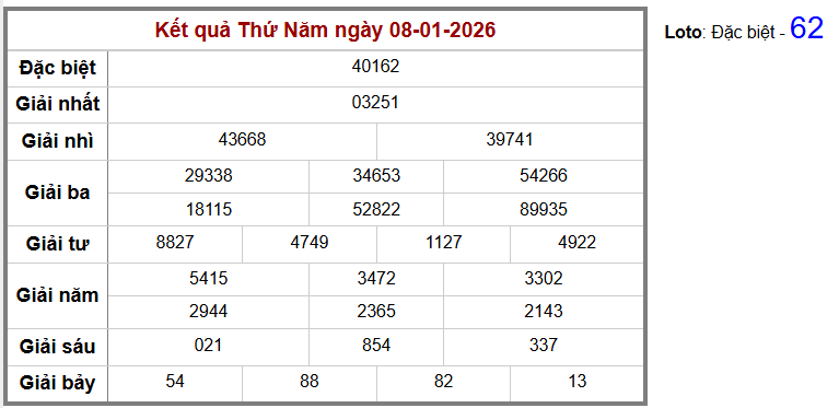 ⚡ Hai số cuối giải đặc biệt 62 Tổng 8