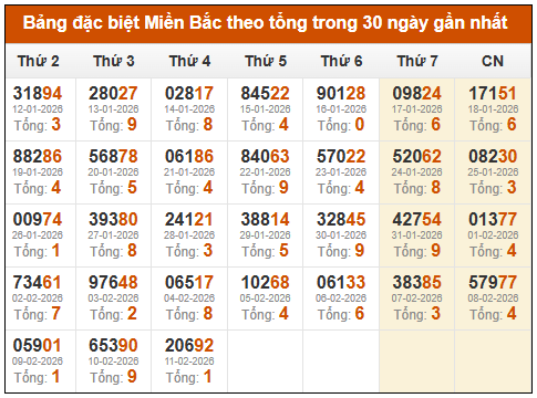 ⚡ Thống kê GĐB xổ số miền Bắc theo tổng: 13/02/2025