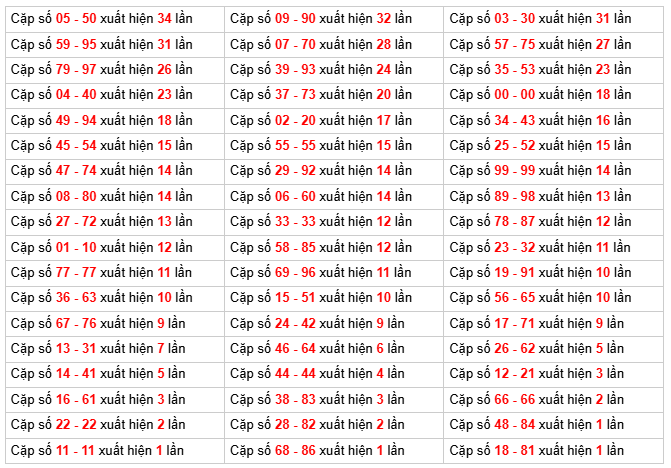⇒ ⇒ Từ bảng thống kê ta thấy tổng đặc biệt lâu không xuất hiện nhất là tổng 0, bao gồm 10 cặp số (00, 19, 28, 37, 46, 55, 64, 73, 82, 91), với tần suất 26 ngày chưa ra.