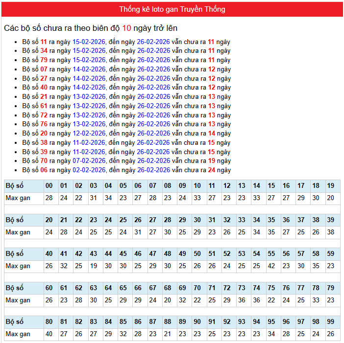 Bảng Thống kê phân tích loto gan Truyền Thống Miền Bắc