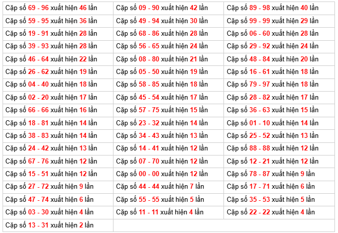 - Kỳ trước có loto: 96 ⇒ Thống kê loto hay về: 63