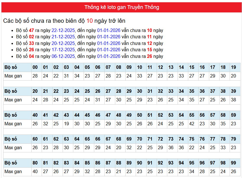Bảng Thống kê phân tích loto gan Truyền Thống Miền Bắc