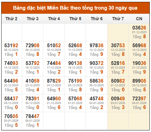 ⚡ Thống kê GĐB xổ số miền Bắc theo tổng: 07/01/2025