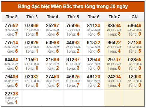 Thống kê GĐB miền Bắc theo tổng trong 30 ngày tính đến 15/04/2026