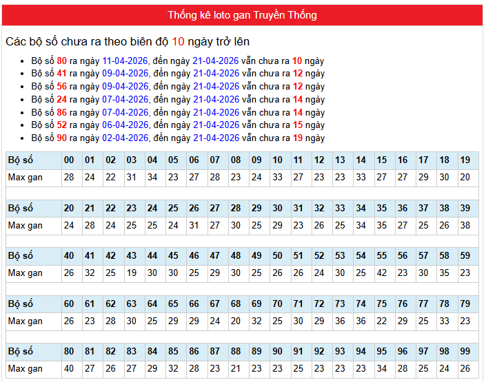 Bảng Thống kê phân tích loto gan Truyền Thống Miền Bắc