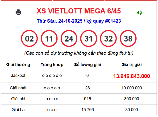 Kết quả Vietlott Power 6/45 :