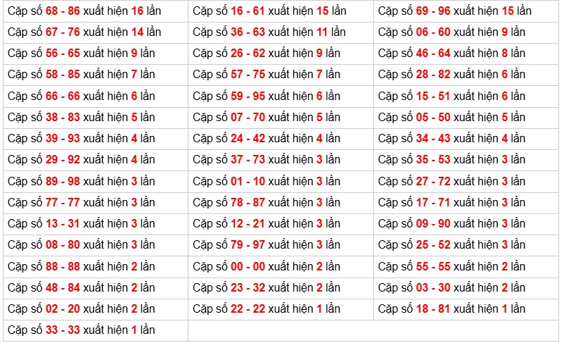 • Kỳ trước có loto 86 ⇒ Thống kê loto hay về: 58