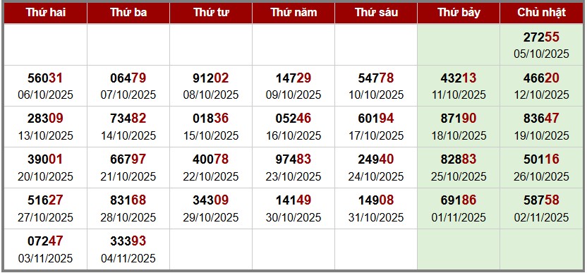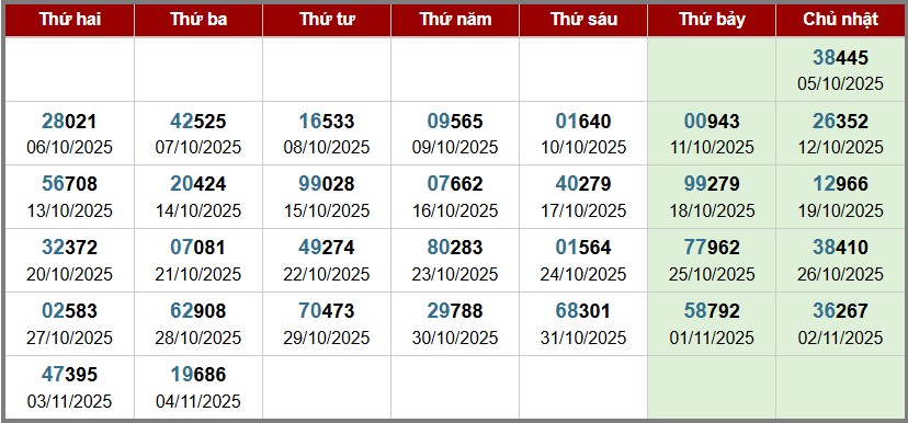 Bảng giải nhất xổ số Miền Bắc theo tuần