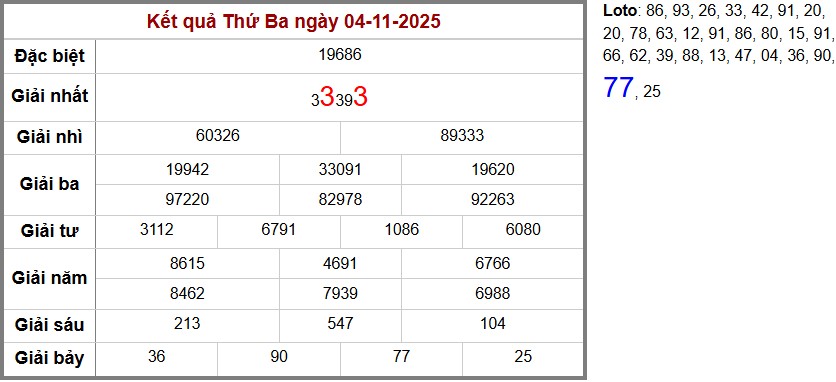 Chi tiết cầu Loto Truyền Thống biên độ: 3 ngày tính từ ngày 04-11-2025. Cặp số: 33 – xuất hiện: 02 lần
