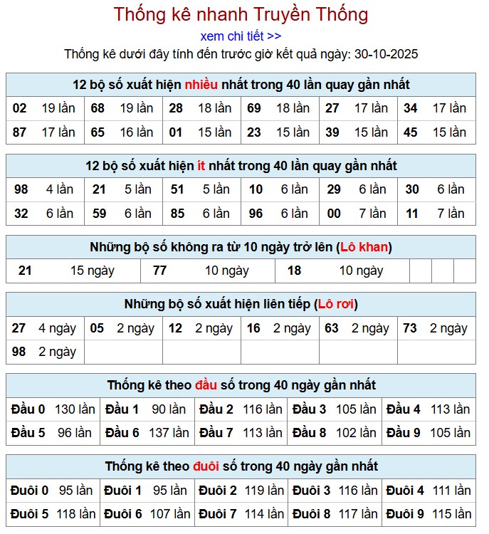 Chi tiết cầu Bạch thủ Truyền Thống biên độ: 3 ngày tính từ ngày 29-10-2025. Cặp số: – xuất hiện: lần