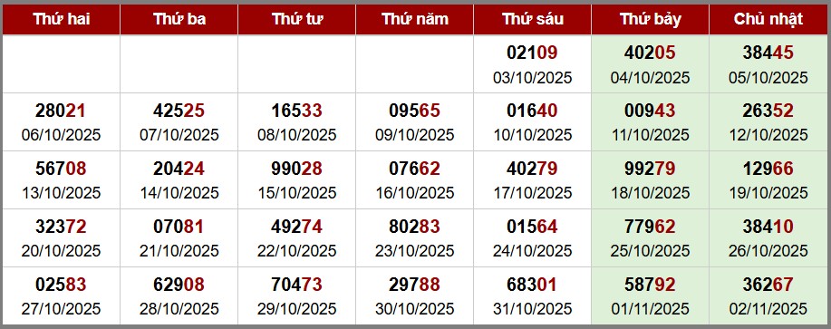 Bảng đặc biệt xổ số Miền Bắc theo tuần